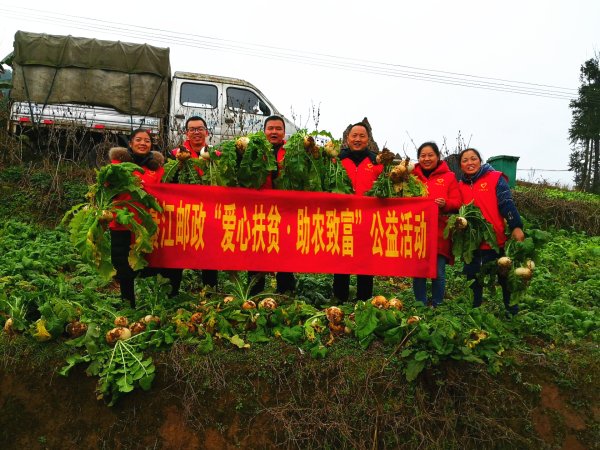 1月9日下午,綦江区分公司发起以“爱心扶贫,助农致富”为主题的公益行动。邮政员工深入田间地头,帮助农户摘柚子、拔萝卜,同时通过“优惠购”活动,将这些优质果蔬回馈给VIP客户,帮助农户增收的同时,为客户送去实惠。