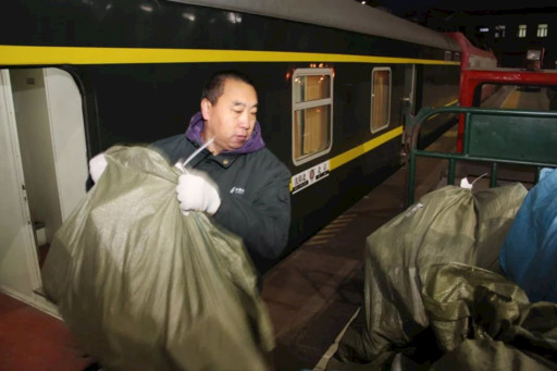 7点,鸣笛声由远而近,K54次列车缓缓驶入站内。车门打开后,郑重进入列车内与押运员进行邮件交接,随后加入卸车员队伍,帮助大家将车厢内的一袋袋邮件搬运到托车上。一阵紧张有序的忙碌过后,郑重拉着装有100多袋邮件的牵引车缓缓驶出站台。