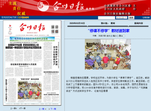 3月10日,合川官媒《合川日报》头版、要闻版以《“停课不停学”,教材送到家》《做好投递服务,践行国企担当》为题宣传报道了疫情期间合川邮政为民服务的积极作为,点赞邮政在特殊时刻展现出的“国家需,邮政在”的责任感和使命感。合川新闻网也进行了同步报道。
