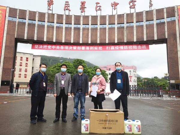 4月20日,綦江邮政向当地首批复课的綦江实验中学、綦江中学、南州中学捐赠价值1万元的口罩、消毒液等防疫物资,助力开学复课,受到校方高度赞扬。