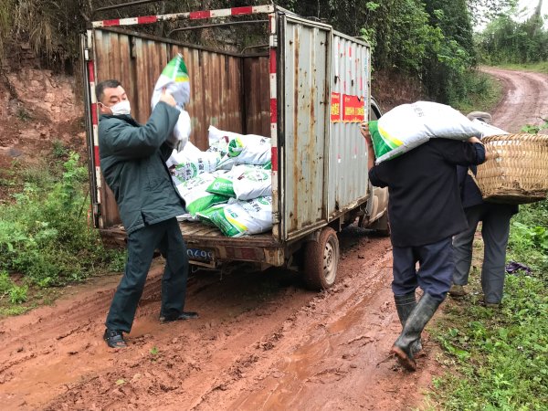 和前两次一样,药材基地路面依旧泥泞。知道丁茂强的货车开不进去,陈老板早早便带着几名工人等在路口。待车子停稳,大家你一袋我一袋,帮着丁茂强卸货,用肩和背篓载着“希望”,深一脚浅一脚地直奔种植基地……
