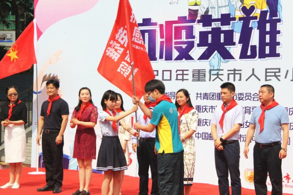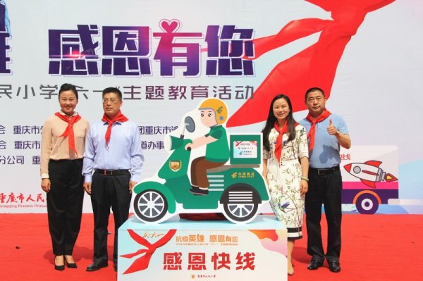 5月29日上午,在儿童节即将到来之际,渝中区人民小学举行“抗疫英雄,感恩有您”六一主题教育活动。共青团重庆市委及渝中区教委、区公安分局、区妇联等领导,渝中区分公司总经理贺靖军、副总经理李江以及40名邮递员参加了活动。活动中,人民小学的小朋友们为“绿衣使者”系上红领巾,并送上他们亲手准备的礼物和感恩卡,感谢邮递员叔叔阿姨在疫情期间冒着生命危险运送抗疫物资、配送教辅教材,并由少先队员代表将感恩旗交到邮递员手上。“人民小学六一主题教育活动,感恩快线出发!”随着主持人的宣布,400余份来自小朋友的礼物和感恩卡,将通过“绿衣使者”在今天送达渝中区的各个派出所、医院和社区。