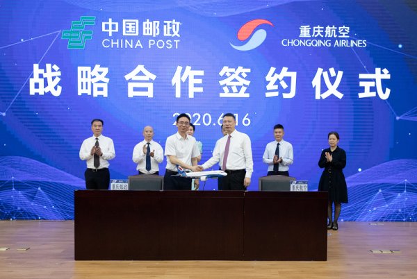 6月16日,重庆邮政与重庆航空正式签订战略合作协议,共同开启双方精诚合作新征程。重庆航空有限责任公司总经理金巍峰、中国邮政集团有限公司重庆市分公司副总经理熊岗出席仪式并致辞,分别代表双方签订战略合作协议。前期,双方已在"悦享行"系列产品营销代理中开展业务合作。此次强强联手,重庆邮政将联合邮储银行重庆分行,与重庆航空密切合作,利用各自优势资源,在金融、快递物流和文化宣传等领域开展合作。