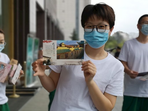 3月26日下午,人民日报社新媒体中心、武汉市邮政分公司、武汉武昌区疫情防控指挥部共同举办“同舟共济 感恩有您”为援汉医疗队赠礼活动,医疗队员们对武汉风光明信片爱不释手。图为医疗队员展示自己最喜欢的武汉大学风光明信片。□李汉梅 摄