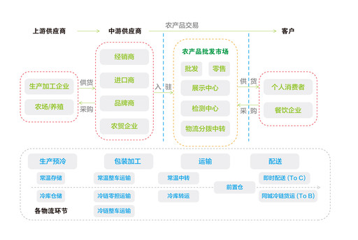 农产品供应链是以农产品供应为核心,由原材料供应商、生产商、加工者、物流服务和消费者等构建的一种组织形式和网络架构,涉及物流、资金流及信息流。其中,农产品物流担当着畅通供需渠道的角色,对农产品流通中人、货、场资源的深度融合起着重要的支撑作用。与工业物流基本功能相似,农产品物流也具备运输、储存、流通、加工、配送、装卸搬运﹑包装和信息处理等基本功能。从温度、重量、速度的角度来看,又分别涉及冷链物流,农产品零担运输及近几年兴起的前置仓、即时配送等。
