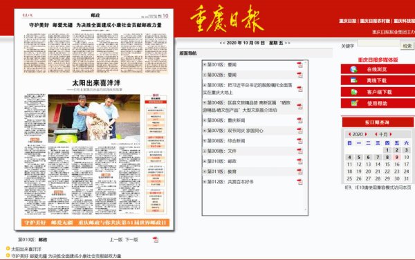 围绕世界邮政日宣传及重庆邮政助力打赢脱贫攻坚战这一主题,《重庆日报》今日第10版上整版全彩刊发了集团公司刘爱力董事长的世界邮政日致辞及石柱土家族自治县的邮政扶贫故事,并以“数说”形式,展现了近年来重庆邮政在开展电商扶贫上的重大成就。