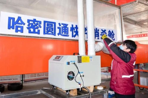 12月7日,哈密天顺物流园内的哈密圆通快递公司分拨中心入口处,工作人员正在为消杀舱雾化机添加按规定配比的消毒液。记者李文龙摄