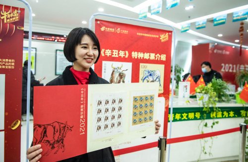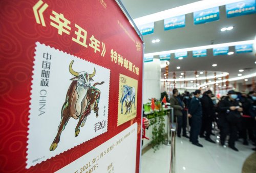 当日,中国邮政发行《辛丑年》特种邮票1套2枚,图案分别为“奋发图强”“牛年大吉”。