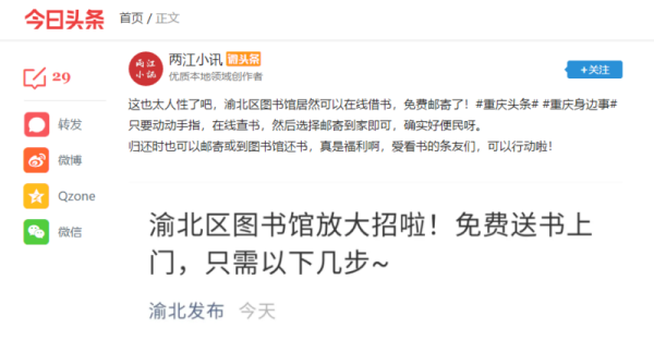 2月23日,《今日头条》聚焦渝北邮政“图书到家”项目,获得广泛关注及好评。前期,渝北片区寄递事业部与渝北图书馆就图书线上邮寄服务进行深入交流,并组织营销、技术人员与图书馆、软件公司多次商谈寄递服务方案、APP功能新建及调整、系统对接等,获客户认可并顺利签约。通过图书在线借阅邮寄试运行,2月18日“图书到家”项目正式上线运行,获得渝北图书馆和借阅人好评。