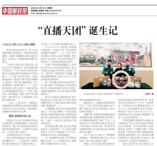 在经过推荐、评选、专家评议、公示等流程评选而出的9件获奖作品中,由重庆邮政李平、袁怡、刘慧卿撰写的《“直播天团”诞生记》获得通讯类三等奖,是所有获奖作品中唯一一个非报社本部门记者撰写的稿件。