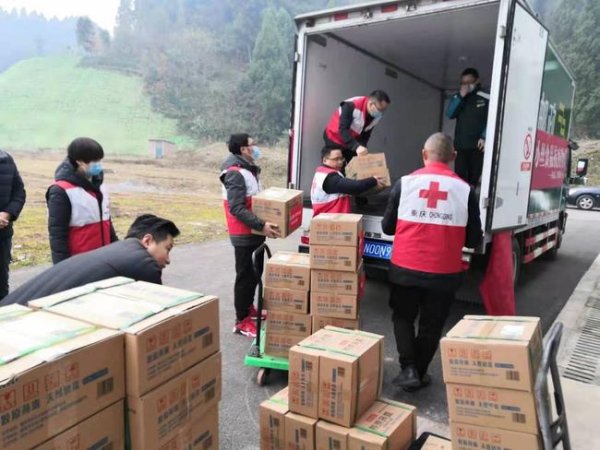说干就干!1月4日,重庆市水火土食品产业有限公司门口,在石柱县疫情防控指挥部、县红十字会及石柱邮政志愿者齐心协力下,400件物资不到1个小时全部装车完毕。