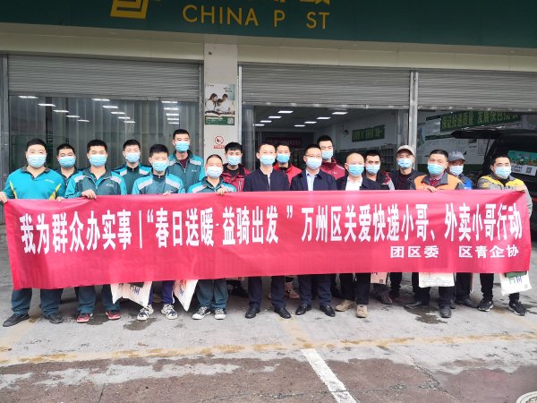 3月30日下午,万州团区委联合万州区青年企业家协会到万州邮件处理中心开展“春日送暖·益骑出发”关心关爱活动。慰问组为邮政投递员送上防疫物资、水果、便携式雨衣等慰问品,对邮政投递员夜以继日、风雨无阻的辛苦付出表示感谢,叮嘱大家在坚守岗位的同时,做好疫情防控等工作。