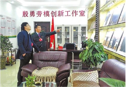 殷勇(右)向时任泗洪县检察院检察长介绍“殷勇劳模创新工作室”,并对检察工作建言献策