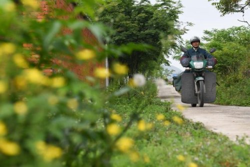 在安徽省巢湖市散兵镇山区里,郑爱军骑行在投递邮件的路上(4月30日摄)。