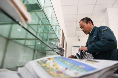 在中国邮政集团公司安徽省巢湖市散兵支局,郑爱军分拣报纸(4月30日摄)。