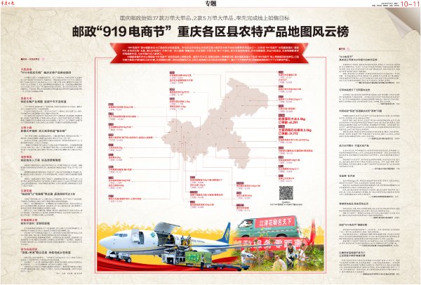 9月19日,重庆日报以《邮政“919电商节”重庆各区县农特产品地图风云榜》为题对重庆邮政“919电商节”进行了专题报道。而后,重庆市人民政府网、人民网、新华社、光明网、华龙网、半月谈等主流媒体亦同步进行报道。报道以重庆邮政在“919电商节”中劲销的37款万单大单品、2款5万单大单品构建的重庆各区县农特产品地图风云榜为主体,刊载部分产品背后的邮政故事,以及各级政府部门、农业合作社等眼中的“919电商节”,再现重庆邮政服务乡村振兴新作为,引发广泛关注、受到广泛好评。
