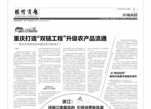 9月21日,《国际商报》推出重庆县域商业体系建设系列报道三。其中,以《重庆打造“双链工程”升级农产品流通》为题,报道了重庆邮政利用“双链工程”(产业链和流通链)助力重庆县域商业体系建设,畅通工业品下乡和农产品进城渠道。
