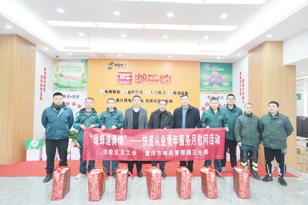 2月22日,涪陵区总工会、市邮管局三分局到中邮涪陵片区分公司开展“暖蜂递真情”——快递从业青年服务月慰问活动,为邮政快递小哥送上牛奶、大米等慰问包,与大家亲切交谈,了解其生产生活情况、近期的揽投量,叮嘱大家要劳逸结合、注意出行安全,确保身体健康。