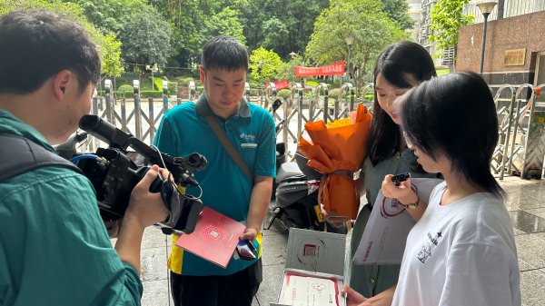经过10分钟的车程,媒体记者一路跟随邮车前行,和喻奎一同到达第一位考生所在地。15:20,在仔细核对身份证和准考证后,喻奎将通知书和一束鲜花交到陈熙同学手上,恭喜她梦想成真。半小时直播不仅赢得全网关注度,超30万人观看,还获得一大波点赞。“投递员辛苦了!”“邮政小哥,期待你给我送通知书!”等留言纷纷霸屏。