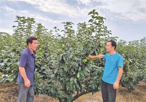 丁丹伟(右)在了解果树长势时与农户交谈。