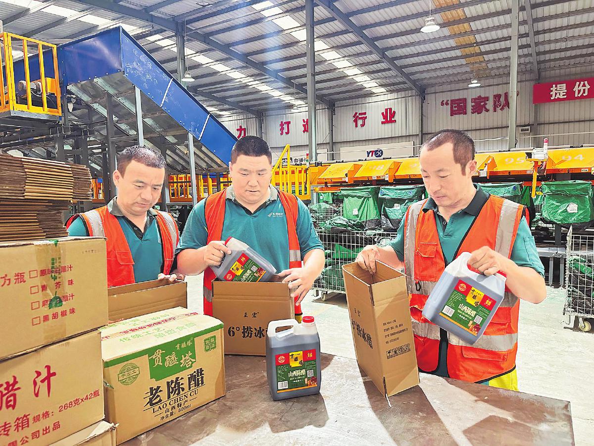 在寄递物流共配中心内,邮政员工正在打包陈醋邮件。