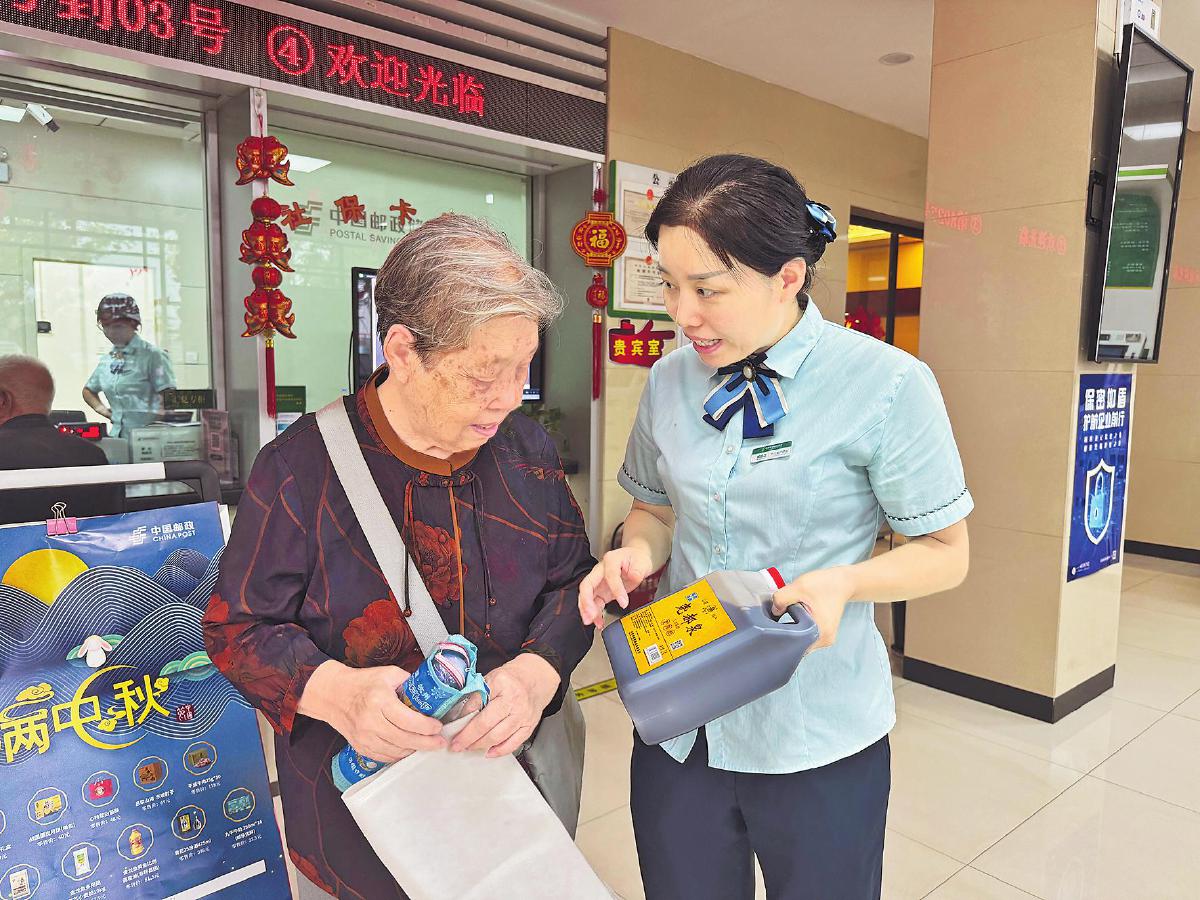 “月满中秋”活动中,邮政网点员工向客户推介陈醋产品。