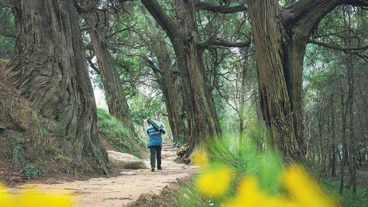 剑阁县邮政分公司投递员为龙源镇的农户送肥料,途中经过蜀道古柏群。□张平 摄