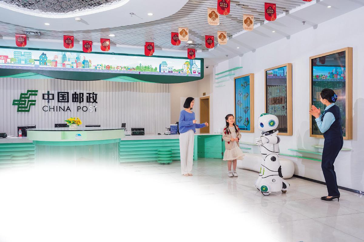 在山东省济南市趵突泉邮政支局,圆润可爱的智能机器人“小邮”正与小朋友共舞。