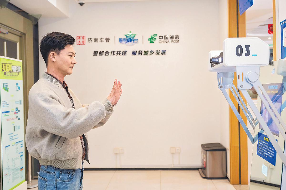 在济南市趵突泉邮政支局警邮自助终端前,市民“一站式”高效办理驾驶证换证手续。