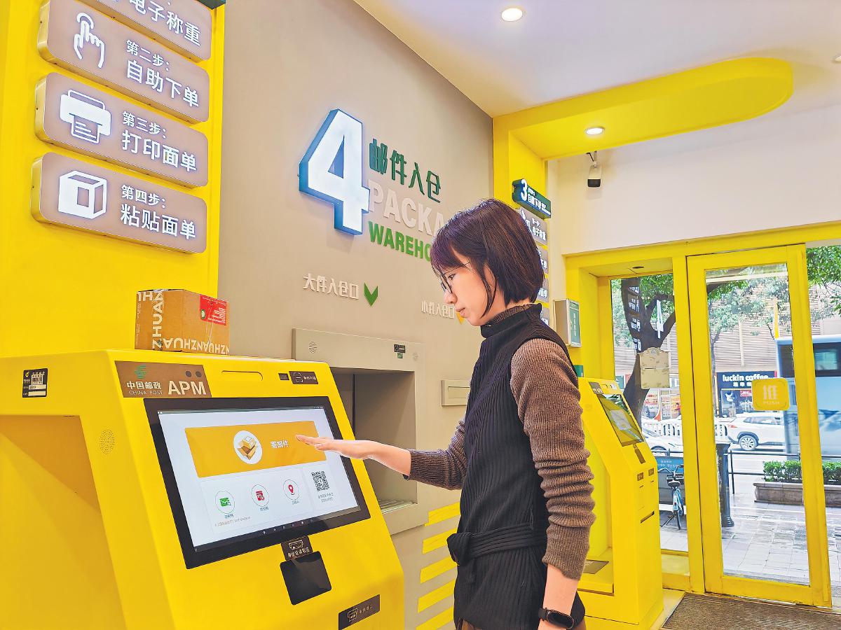 在广东省深圳市的自助体验式邮局,客户通过智能设备轻松完成包裹寄递。
