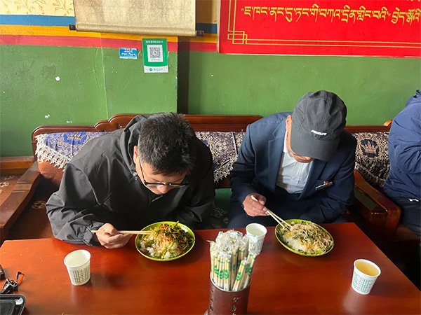 午饭时间,乡政府旁的索多藏餐馆里挤满了来用餐的人。有观光的游客,有像我们一样到这里工作的外乡人,还有本地的老百姓。记者和曲巴一起回忆起10年前在普玛江塘只能吃面包、泡面的采访经历。曲巴说:“现在乡上开了3家餐馆,大家也能吃上热乎乎的饭菜了。”记者点了一份青椒肉丝盖饭,曲巴要了一份小白菜盖饭。我们吃得一干二净!