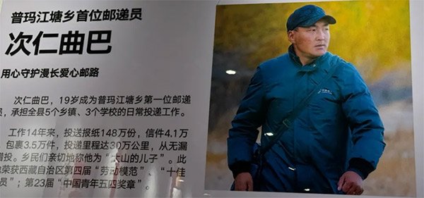 离开普玛江塘前,普玛江塘乡党委副书记、人大主席洛桑久乃热情地邀请采访组参观位于乡政府内的边境红色教育基地。在普玛江塘杰出人物展区,记者一下就看到了次仁曲巴事迹的展板,2019年他荣获了第23届“中国青年五四奖章”。洛桑久乃充满感慨地说:“中国邮政和我们地方党委、政府一样,无论谁来谁走,都会永远坚守在这高寒的边境线上。乡亲们需要我们,国家需要我们!
