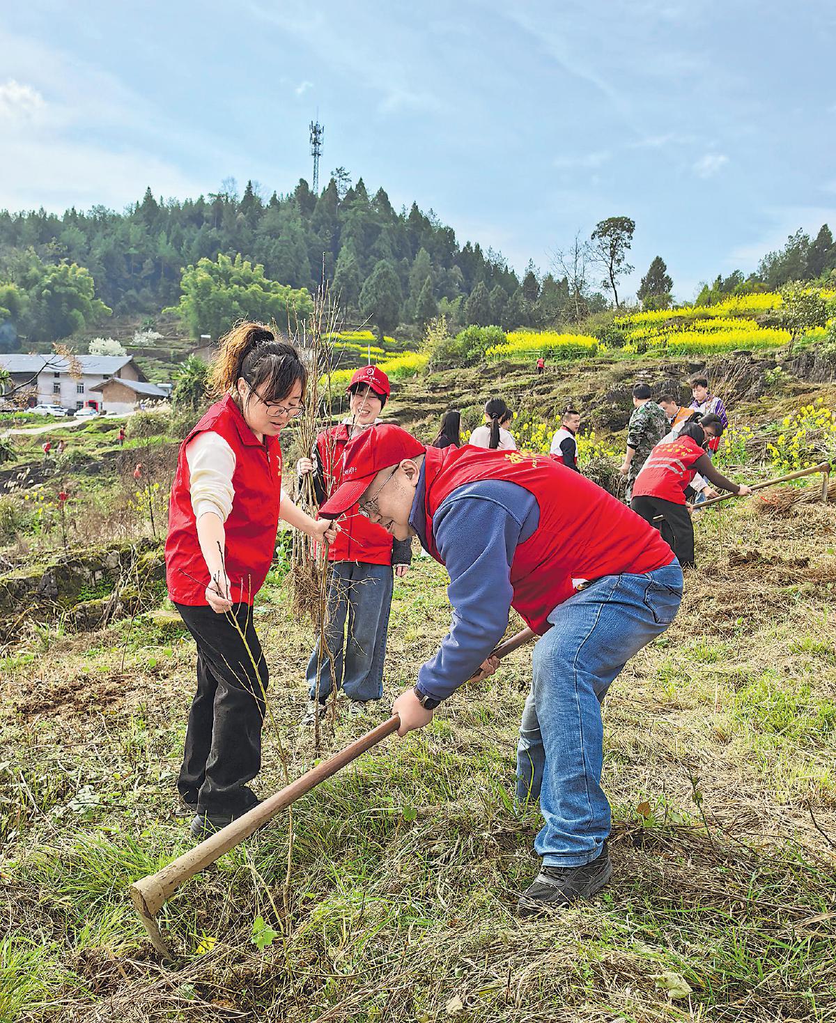 重庆市南川区邮政分公司党总支联合团区委、水江镇党委开展党建共建活动,组织党团员志愿者走进下乐村,开展春季义务植树。大家共栽种桃树、樱花树300棵,践行了绿色发展理念,生动展现了“绿色邮政”的良好形象。□赵娟 摄影报道